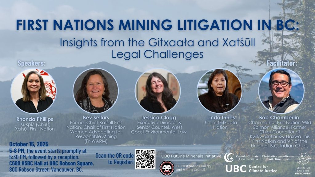 This panel will explore two landmark legal challenges shaping the future of mining in British Columbia. Panellists will examine the Gitxaała Nation’s case against the province’s mineral tenure regime and the Xatśūll First Nation’s judicial review of decisions related to the Mount Polley mine disaster. Together, these cases highlight how First Nations are using the courts to assert jurisdiction, demand accountability, and redefine the legal landscape of resource governance in BC.
